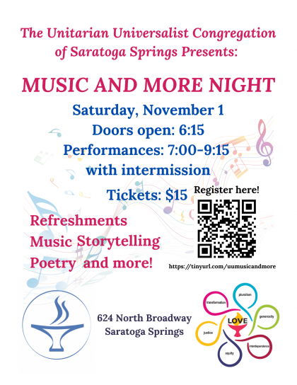 Admission: $15 per person (advance sale using this form) (please feel free to add 5% if using a credit card to offset the fees charged to UUSaratoga)